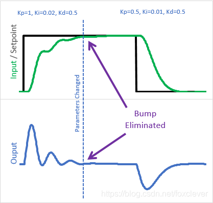 我们现在保留一个有效的和组成的P项,而不是将输入-初始输入作为一个整体乘以Kp。在每一步中,我们只需将当前输入变化乘以当时的Kp,并从P项(第41行) 中减去它。在这里,我们可以看到变化的影响: