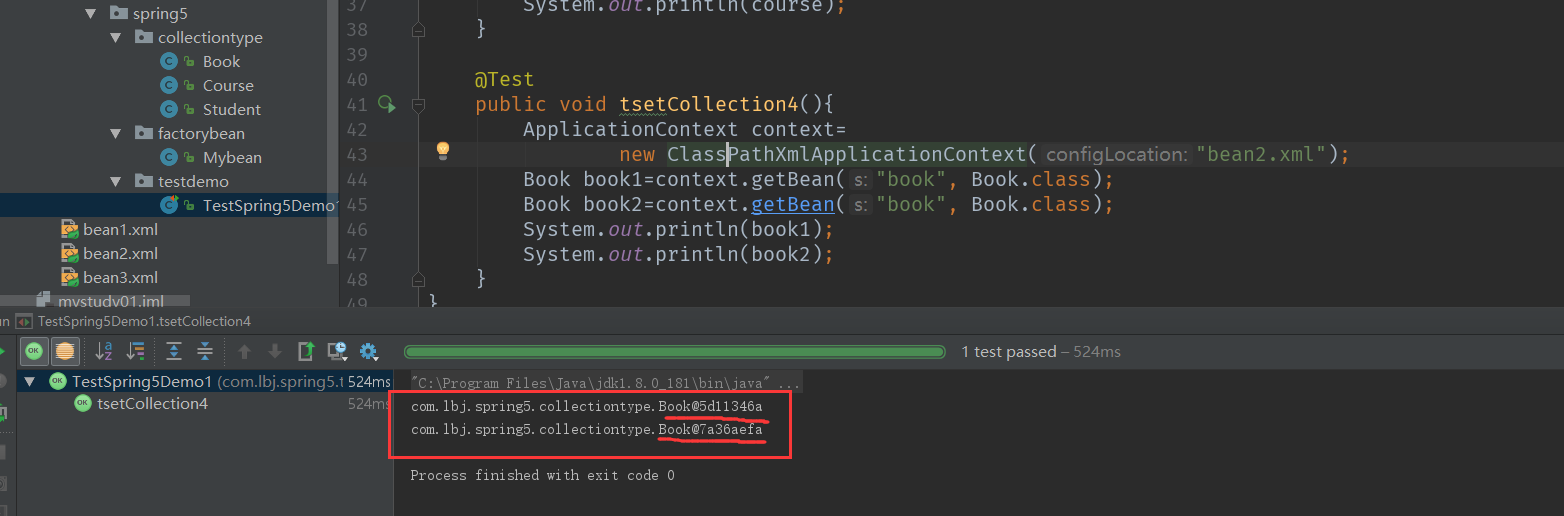 import org.springframework.context.support.ClassPathXmlApplicationContext;public class TestSpring5Demo1 {@Testpublic void tsetCollection4(){ApplicationContext context=new ClassPathXmlApplicationContext("bean2.xml");Book book1=context.getBean("book", Book.class);Book book2=context.getBean("book", Book.class);System.out.println(book1);System.out.println(book2);}