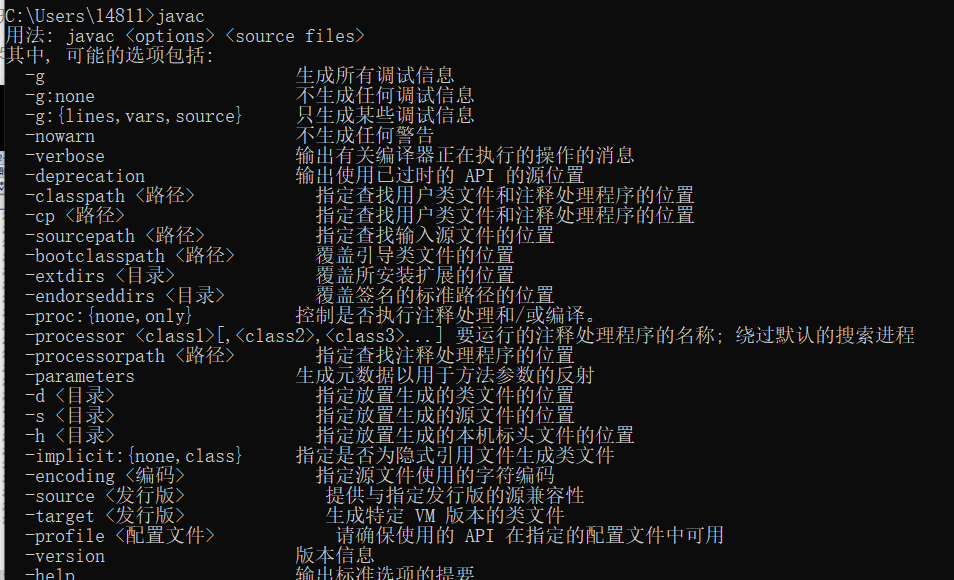 切换盘符后测试一下javac是否可用 输入 javac会出现以下(意味着javac工具可用):