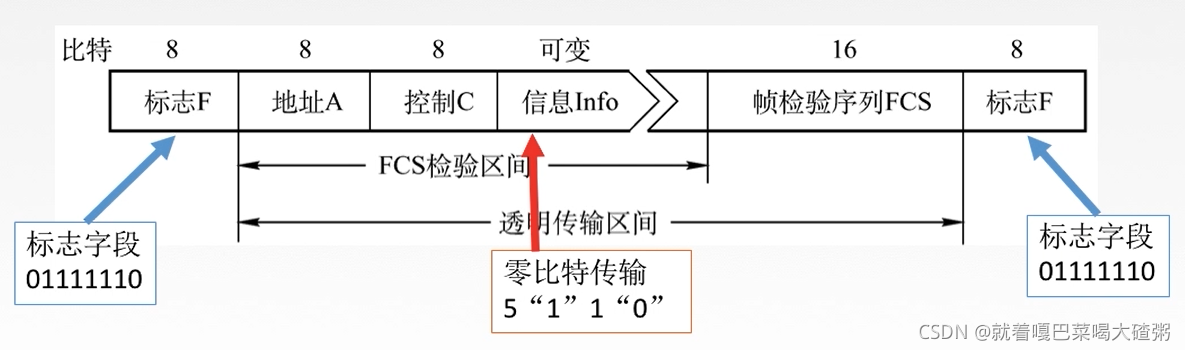 - 信息帧第一位为0,用来传输数据信息,或使用捎带技术对数据进行确认