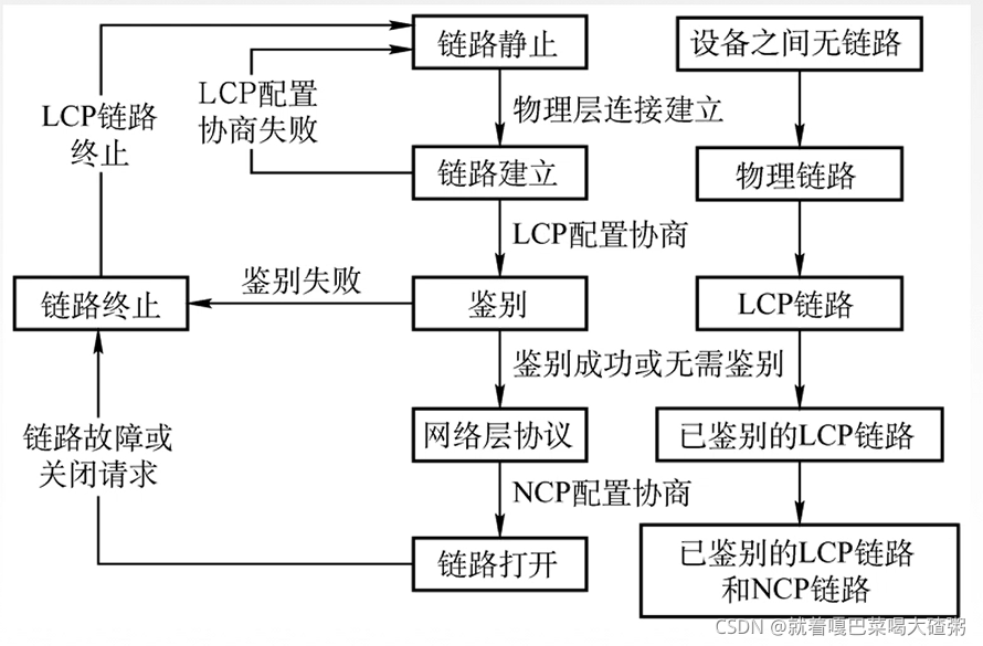 - 网络控制协议NCP:PPP可支持多种网络层协议,每个不同的网络层协议都要一个相应的NCP来配置,为网络层协议建立和配置逻辑连接。