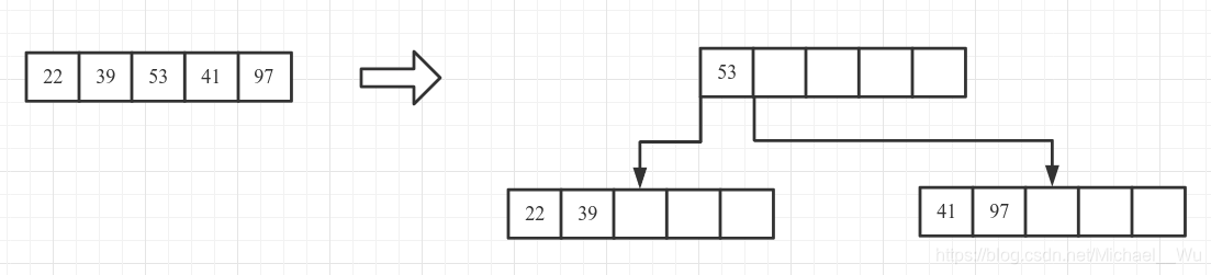 2. 如果被插入后的节点的key总数达到了M, 就需要对该节点, 按照key序列的中间左右分开进行分裂, 中间的key插入其父节点.