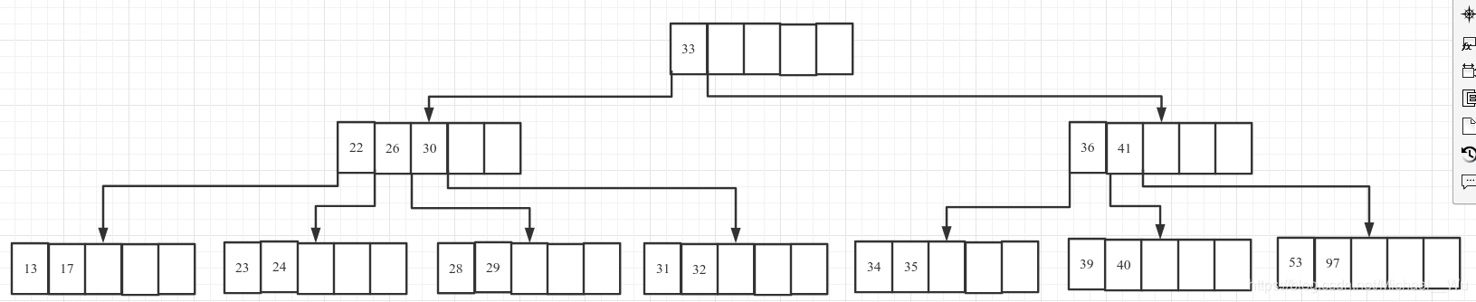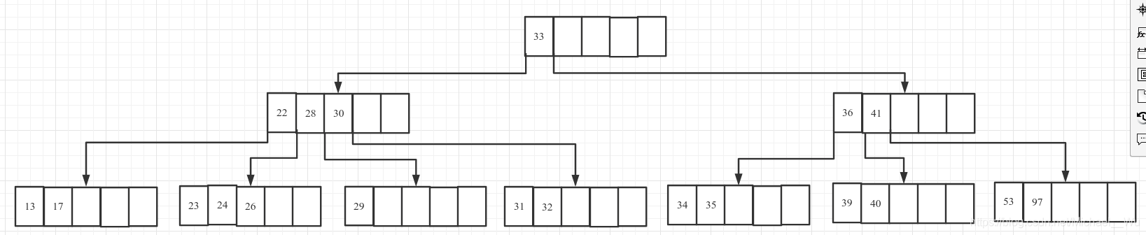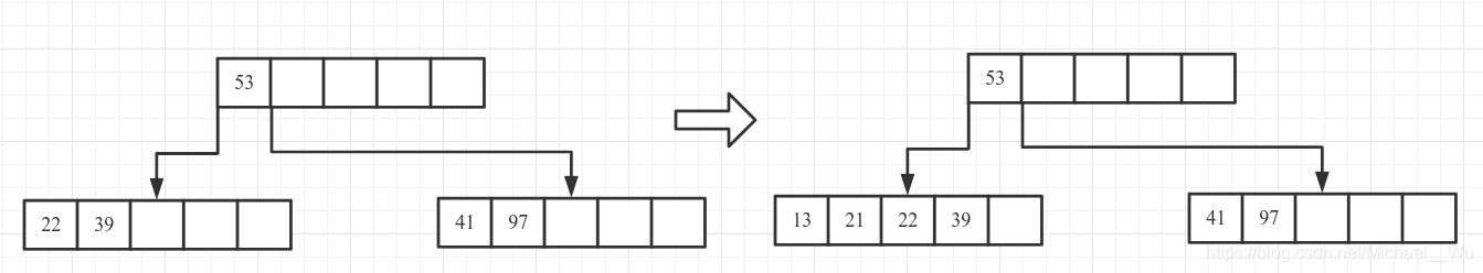 4. 每个节点中的关键字都按照从小到大的顺序排列, 每个关键字在左子树中的所有关键字都小于它本身的关键字, 右子树的都大于它本身关键字.