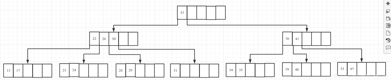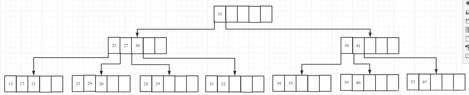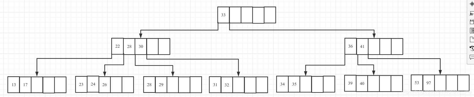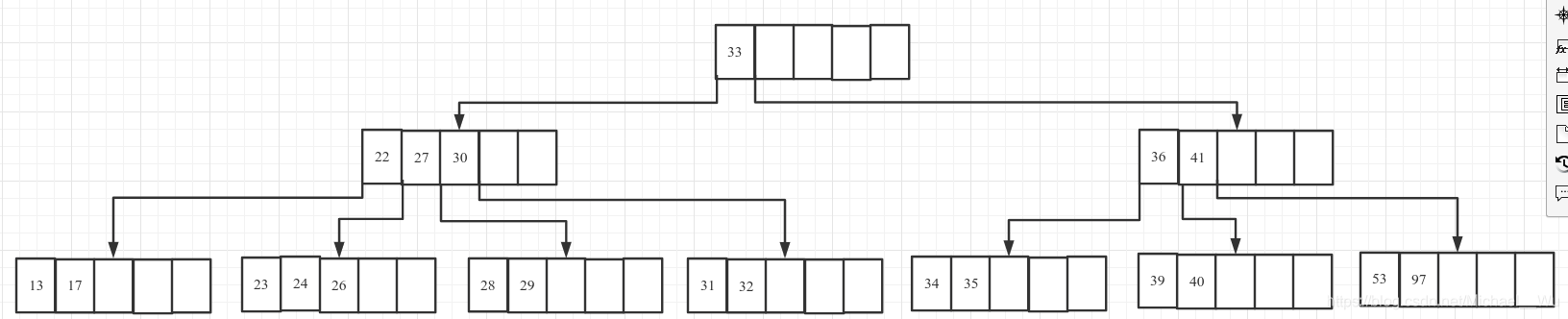 5. 插入30, 27, 33, 其中33插入后, 该节点满, 导致其分裂, 33进入父节点:
