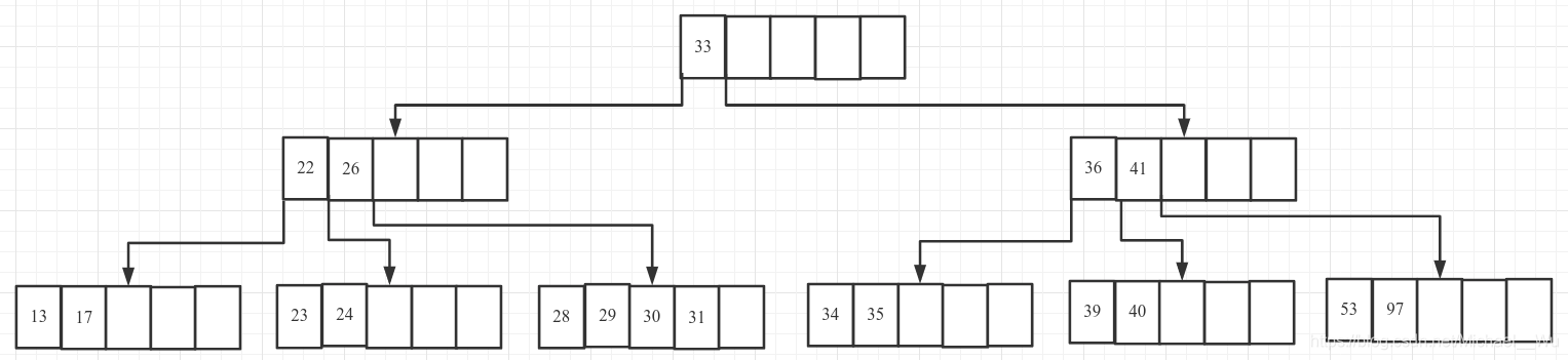 1. 原始状态5阶B树, 每个非根节点的最少关键字数量为ceil(5 / 2) - 1 = 2: