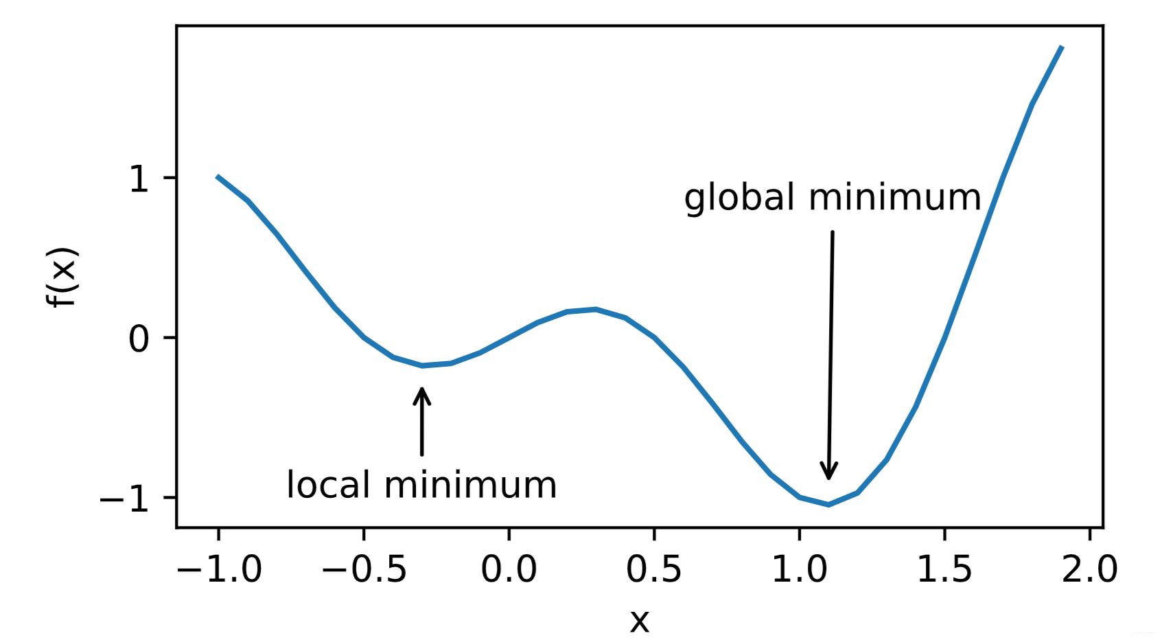 对于目标函数f(x)f(x)f(x),如果f(x)f(x)f(x)在xxx上的值比在xxx邻近的其他点的值更小,那么f(x)f(x)f(x)可能是一个局部最小值(local minimum)。如果f(x)f(x)f(x)在xxx上的值是目标函数在整个定义域上的最小值,那么f(x)f(x)f(x)是全局最小值(global minimum)。