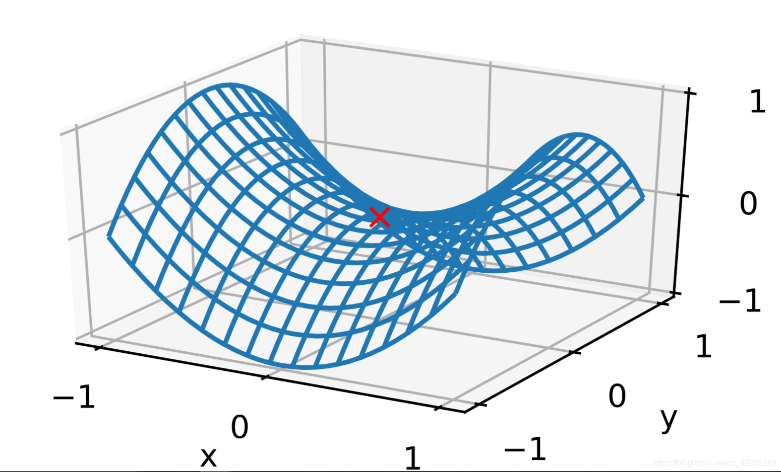 - 在图的鞍点位置,目标函数在xxx轴方向上是局部最小值,但在yyy轴方向上是局部最大值。