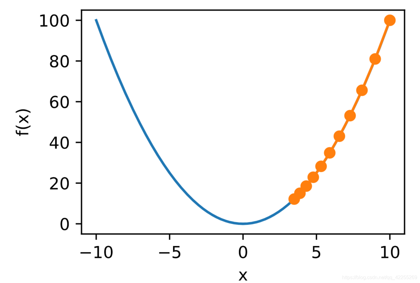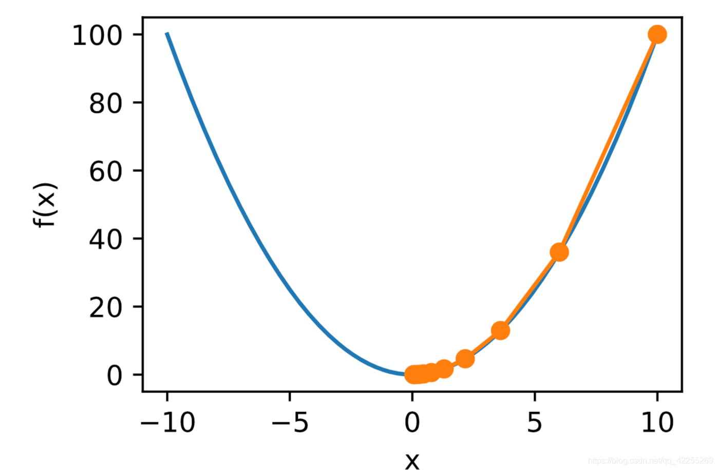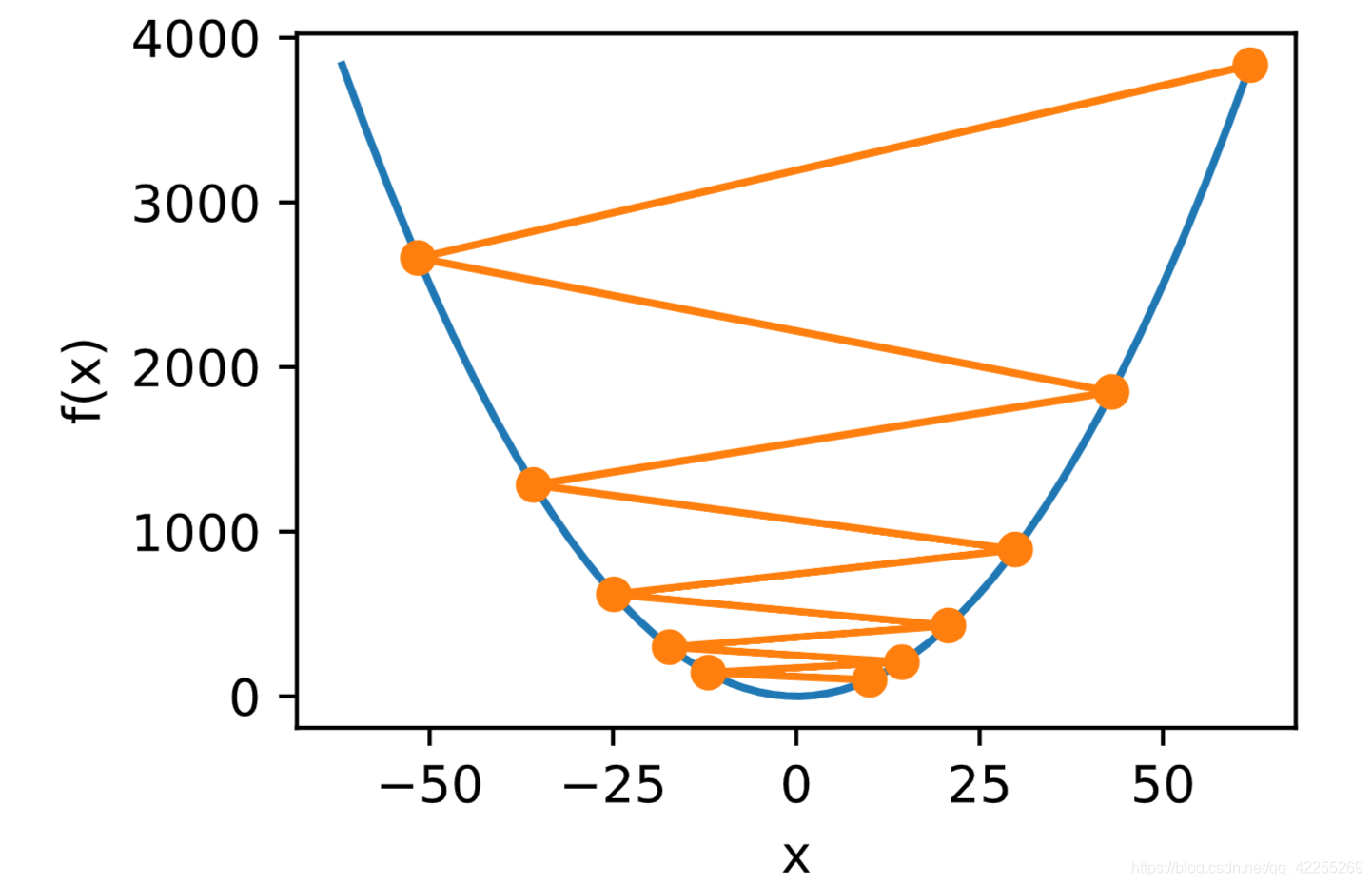 def show_trace(res):n = max(abs(min(res)), abs(max(res)), 10)f_line = np.arange(-n, n, 0.1)set_figsize()plt.plot(f_line, [x * x for x in f_line])plt.plot(res, [x * x for x in res], '-o')plt.xlabel('x')plt.ylabel('f(x)')show_trace(res)