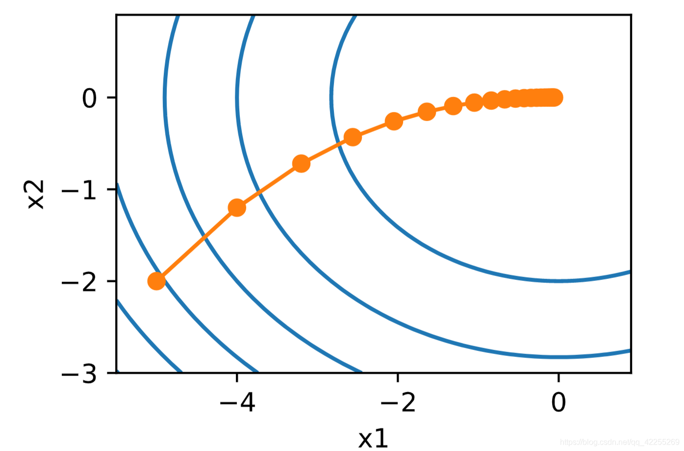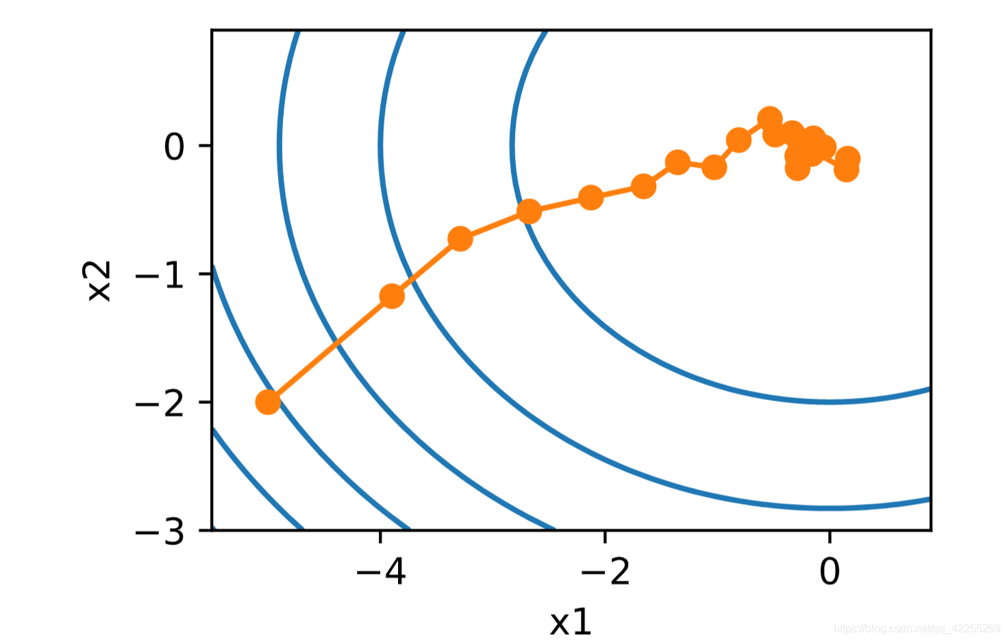 def train_2d(trainer): x1, x2, s1, s2 = -5, -2, 0, 0 # s1和s2是自变量状态,本章后续几节会使用results = [(x1, x2)]for i in range(20):x1, x2, s1, s2 = trainer(x1, x2, s1, s2)results.append((x1, x2))print('epoch %d, x1 %f, x2 %f' % (i + 1, x1, x2))return resultsdef show_trace_2d(f, results): plt.plot(*zip(*results), '-o', color='#ff7f0e')x1, x2 = np.meshgrid(np.arange(-5.5, 1.0, 0.1), np.arange(-3.0, 1.0, 0.1))plt.contour(x1, x2, f(x1, x2), colors='#1f77b4')plt.xlabel('x1')plt.ylabel('x2')