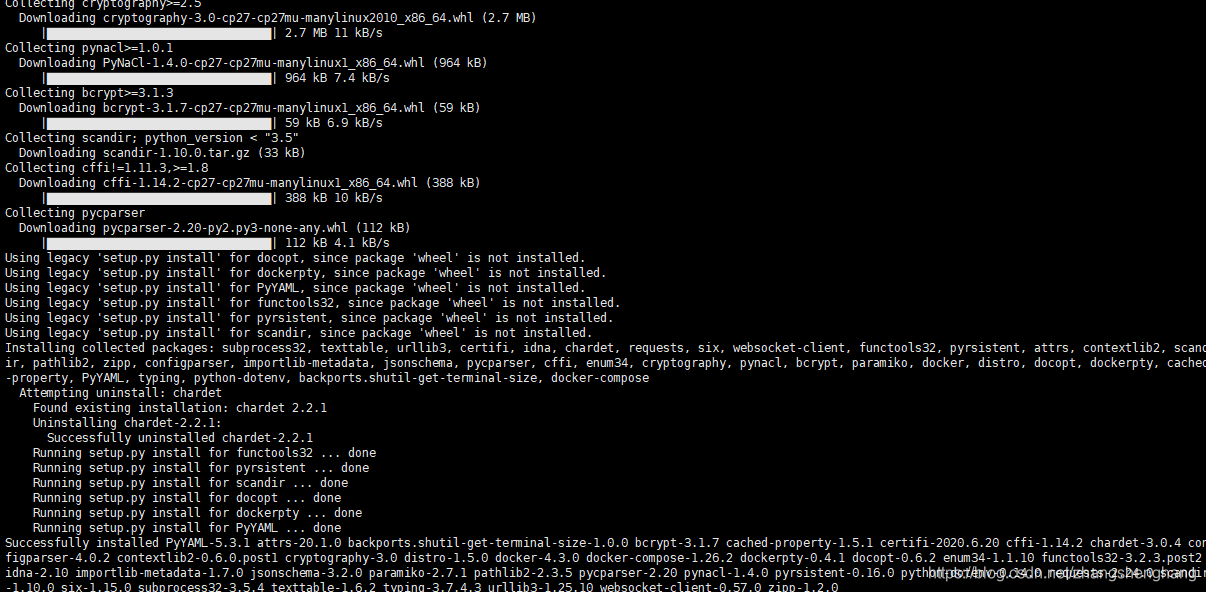 Collecting PyYAML<6,>=3.10Using cached PyYAML-5.3.1.tar.gz (269 kB)ERROR: Command errored out with exit status 1:command: /usr/bin/python2 -c 'import sys, setuptools, tokenize; sys.argv[0] = '"'"'/tmp/pip-install-rrvkCa/pyyaml/setup.py'"'"'; __file__='"'"'/tmp/pip-install-rrvkCa/pyyaml/setup.py'"'"';f=getattr(tokenize, '"'"'open'"'"', open)(__file__);code=f.read().replace('"'"'\r\n'"'"', '"'"'\n'"'"');f.close();exec(compile(code, __file__, '"'"'exec'"'"'))' egg_info --egg-base /tmp/pip-pip-egg-info-52CudBcwd: /tmp/pip-install-rrvkCa/pyyaml/Complete output (19 lines):Traceback (most recent call last):File "<string>", line 1, in <module>File "/tmp/pip-install-rrvkCa/pyyaml/setup.py", line 314, in <module>python_requires='>=2.7, !=3.0.*, !=3.1.*, !=3.2.*, !=3.3.*, !=3.4.*',File "/usr/lib64/python2.7/distutils/core.py", line 112, in setup_setup_distribution = dist = klass(attrs)File "/tmp/pip-install-rrvkCa/pyyaml/setup.py", line 112, in __init___Distribution.__init__(self, attrs)File "/usr/lib/python2.7/site-packages/setuptools/dist.py", line 269, in __init___Distribution.__init__(self,attrs)File "/usr/lib64/python2.7/distutils/dist.py", line 287, in __init__self.finalize_options()File "/usr/lib/python2.7/site-packages/setuptools/dist.py", line 302, in finalize_optionsep.load()(self, ep.name, value)File "/usr/lib/python2.7/site-packages/pkg_resources/__init__.py", line 2443, in loadreturn self.resolve()File "/usr/lib/python2.7/site-packages/pkg_resources/__init__.py", line 2453, in resolveraise ImportError(str(exc))ImportError: 'module' object has no attribute 'check_specifier'---------------------------------------- ERROR: Command errored out with exit status 1: python setup.py egg_info Check the logs for full command output.解决方法:
