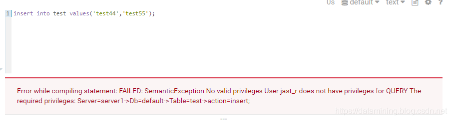 ERROR: AuthorizationException: User 'jast_r@IZHONGHONG.COM' does not have privileges to execute 'INSERT' on: default.test