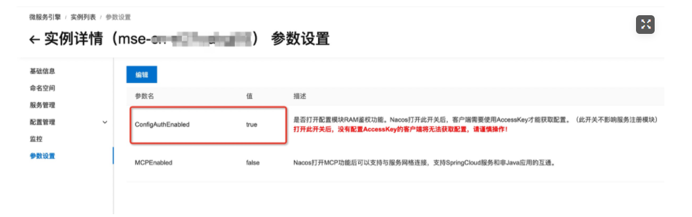 首先,在MSE上申请一个Nacos实例(并记下实例id),然后在实例详情->参数设置界面,将ConfigAuthEnabled(配置鉴权)参数设置为true,这样匿名用户就无法获取配置: