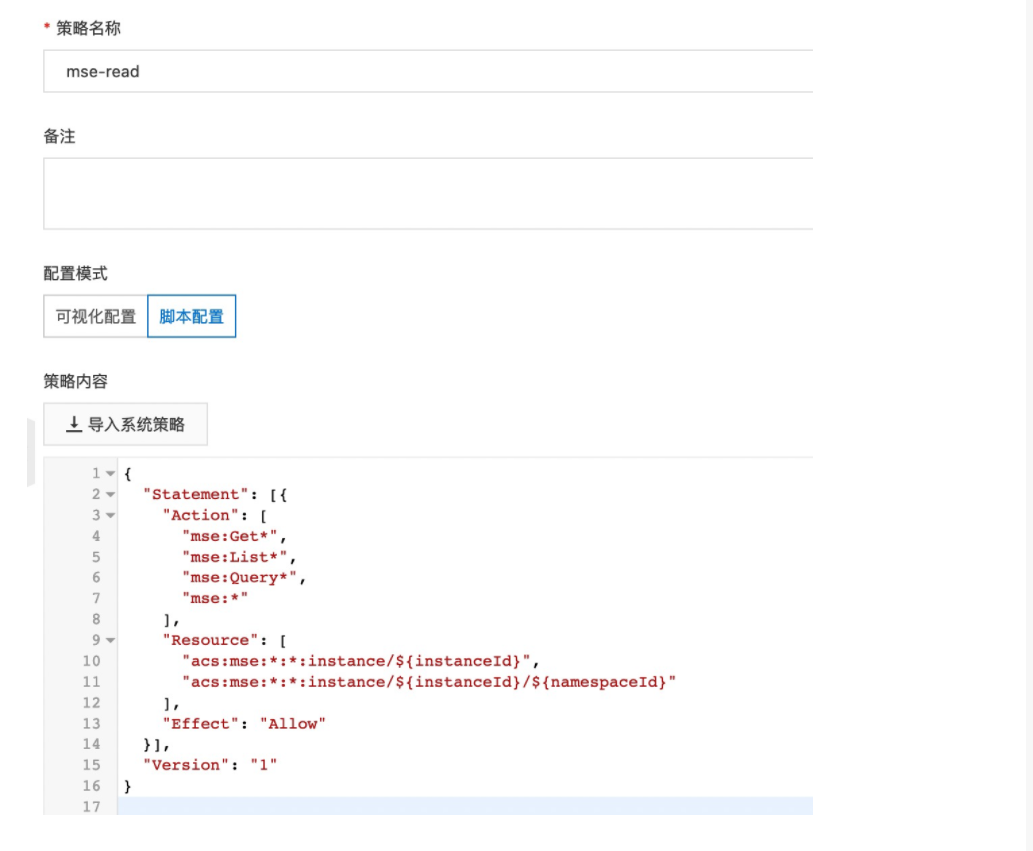 {"Action": ["mse:Get*","mse:List*","mse:Query*"],"Resource": ["acs:mse:*:*:instance/${instanceId}/${namespaceId}"],"Effect": "Allow"