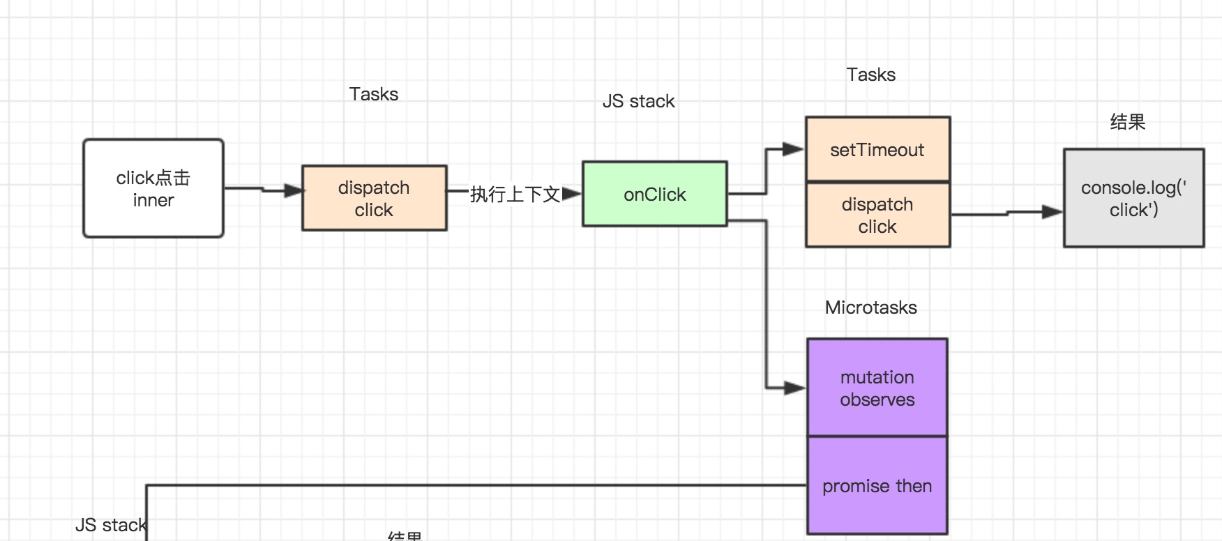 Dispatch click被推入宏任务Event Queue队列中,当点击inner元素时onClick被推入函数调用栈(Js stack)中,执行上下文进入onClick中,将setTimeout的回调函数推入宏任务Event Queue队列中,Mutation observers和Promise then的回调函数推入微任务Event Queue队列中,并执行输出click。