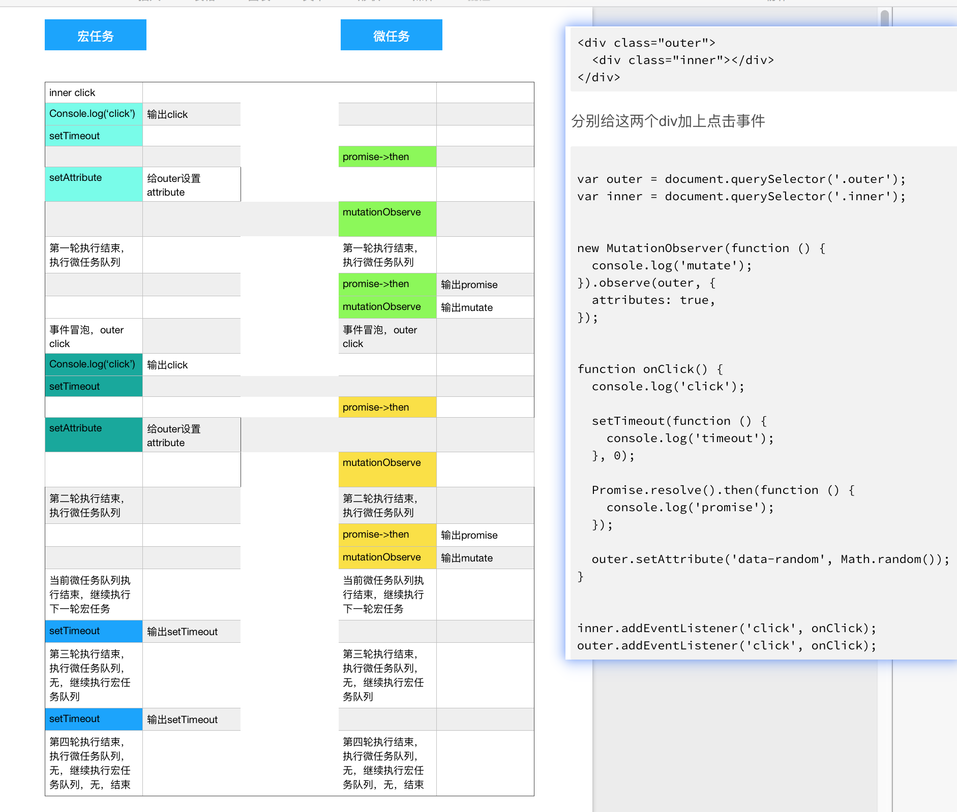 });function onClick() {console.log('click');setTimeout(function () {console.log('timeout');}, 0);Promise.resolve().then(function () {console.log('promise');});outer.setAttribute('data-random', Math.random());