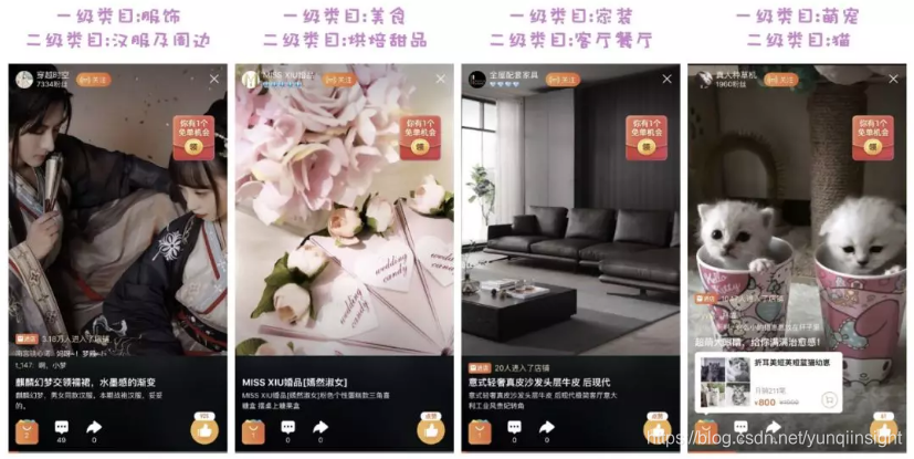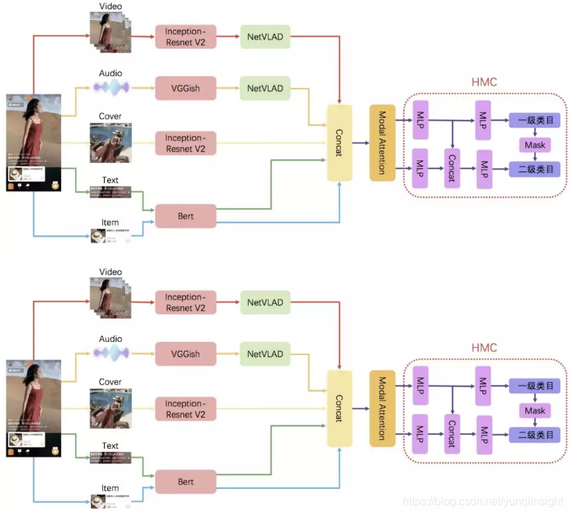 不同于抖音美拍等其他视频的内容体系从新闻、科技、金融等领域做分类划分,淘宝的视频类目体系从商品导购、产品功能展示、商品知识获取等角度出发,由行业经验丰富的运营进行设计,包含了30+一级类目和150+二级类目,其中一级类目是对视频的领域的划分,例如服饰/家居日用/美食/萌宠等,二级类目是在一级类目的基础之上对视频的子领域的划分,例如一级类目服饰下的熟女穿搭/少女穿搭/儿童服饰/中老年穿搭等,图2是视频类目体系的几个案例。在这个体系之上多媒体算法团队投入近半年的时间提出了基于模态注意力机制的多模态分层视频分类算法。