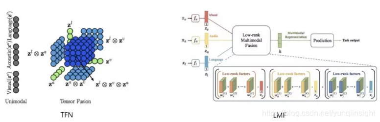 (1) TFN和LMF(如图5所示)都是将多模态特征映射到不同模态间外积的高维特征空间进行特征融合。TFN[6]通过模态之间的外积计算不同模态的元素之间的相关性,但会极大的增加特征向量的维度,造成模型过大,难以训练。而LMF[7]是TFN的等价形式,利用低秩矩阵的分解,将原本的各模态间的先外积再全连接变换过程,等价为各个模态先单独线性变换到输出维度,之后多个维度点积,可以看作是多个低秩向量的结果的和,LMF相比TFN减少了很多参数量,是TFN的优化版本。但在视频分类的算法中,这2种方法的效果都不及预期,分析原因在于视频分类的模态特征长度都在千维左右,即使是LMF也会出现参数数量爆炸的情况,为了保证参数量不爆炸就必须先将每个模态特征降维,然而降维本身是有损的,导致降维后的模态特征再外积不如直接利用不同模态间特征拼接。