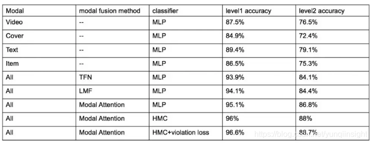 (2) 淘宝视频不同模态之间信息通常是不一致的,这些不一致的模态信息之间有些内容和类别标签息息相关,有些内容则相关性较低。为了关注那些与类别标签相关性更高的模态信息,降低对于不重要模态信息的关注程度,我们提出了基于Modal Attention的多模态特征融合方法。Modal Attention基于融合的特征向量预测一个模态个数维度的基于多模态联合特征的对于不同模态的重要性分布概率,这个模态分布概率与多模态融合特征做点积,得到对于不同模态特征重要性重新加权过后的新的多模态融合特征。从表格1可以看出,基于Modal Attention的多模态特征融合方法的准确率显著超过了TFN和LMF,验证了基于Modal Attention的多模态特征融合方法的优势。