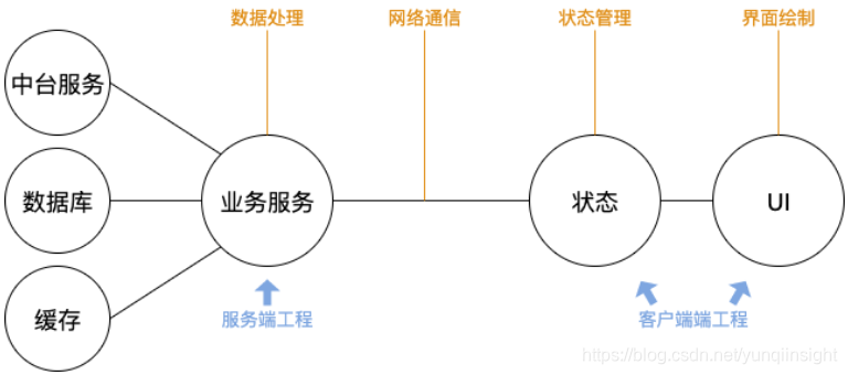 先来看看当前的业务开发形态,如图 2-1,当前在业务开发中几个主要的关注点我大概的归纳为:数据处理,网络通信,状态管理和界面绘制。从这4个点出发,逐一思考,在新的一体化的场景下会有什么变化: