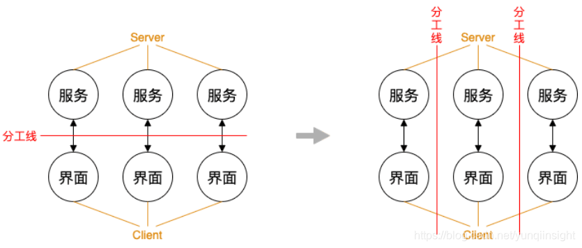在一体化的场景下,业务可以由一个同学负责前后端的开发,最大限度的减小沟通协作成本。当然,大体量的业务必然需要协作的,但协作的方式有所改变,工作的划分可以由传统的前后端的横向划分,变成前后一体的垂直划分,如图 3-1,协作方式的改变也会影响到我们设计的思路。