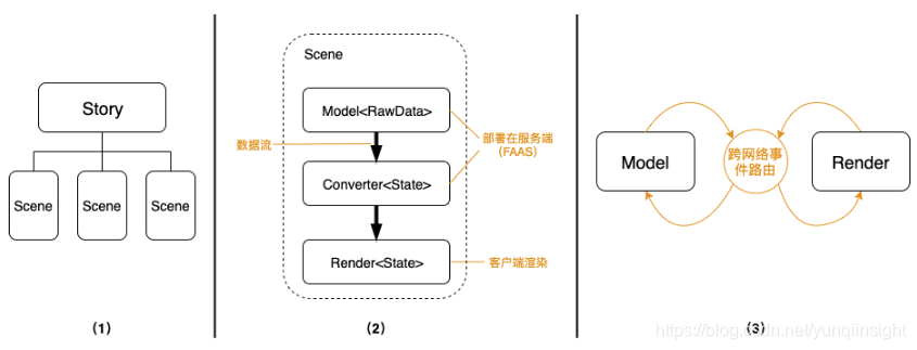 基于前面的讨论,我们尝试做了框架设计:首先我们将要开发的业务命名为一个Story,即一个Story代表一个产品业务,Story会按照上面垂直划分的方式,将业务划分为一系列的Scene。Scene对应于传统意义上的"页面"的概念,但和产品设计上的页面不强求一一对应,如图 3-2-(1)。Scene是个前后一体的虚拟概念,运行时并没有实体。它由3部分组成,如图 3-2-(2), Model部分处理业务数据(RawData),Converter将业务数据转换成渲染所使用的数据(State), 最后Render使用渲染数据绘制界面。Model和Converter部署在后端,在FaaS函数中运行,Render运行在客户端,他们之间的数据流是单向的。在实现逻辑处理的时候,统一使用事件,事件优先在本端处理,本端不处理则路由到另一端,如果另一端也不处理,则丢弃,如图 3-2-(3)。