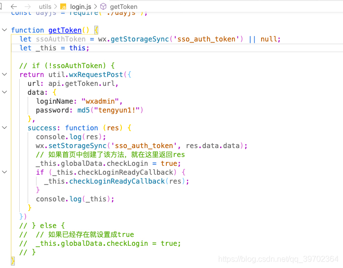 #为了获取token,所以需要搞个模拟登陆,用一个特定的账号,对密码进行md5加密,也只是在app.js那里进行一次调用,这里主要是说一下globalData.checkLogin、checkLoginReadyCallback,这时this指向的是全局的app对象