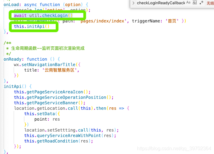 另外还要说下图二的initApi方法,我们所有的页面都有一个initApi的方法,这样做呢是统一把需要初始化的接口放到这里,方便管理,如果全都放到onLoad里执行,管理觉得不方便
