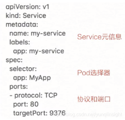 这里有一个新的知识点,就是定义了用于 K8s Service 服务发现的一个协议以及端口。继续来看这个模板,声明了一个名叫 my-service 的一个 K8s Service,它有一个 app:my-service 的 label,它选择了 app:MyApp 这样一个 label 的 pod 作为它的后端。