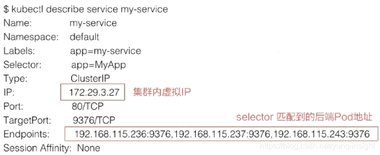 这里还有一个 Endpoints 的属性,就是我们通过 Endpoints 可以看到:通过前面所声明的 selector 去选择了哪些 pod?以及这些 pod 都是什么样一个状态?比如说通过 selector,我们看到它选择了这些 pod 的一个 IP,以及这些 pod 所声明的 targetPort 的一个端口。