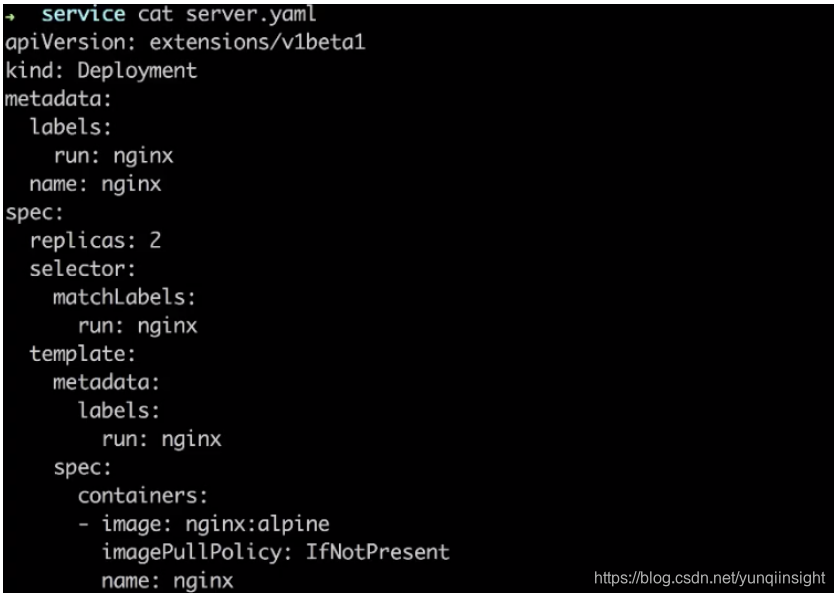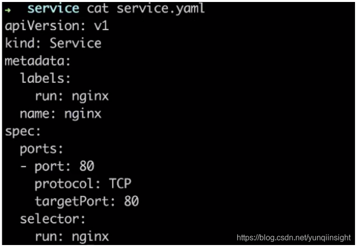 然后去创建带有这样标签的一组 pod,通过什么去创建 pod 呢?就是之前所介绍的 K8s deployment,通过 deployment 我们可以轻松创建出一组 pod,然后上面声明 run:nginx 这样一个label,并且它有两个副本,会同时跑出来两个 pod。