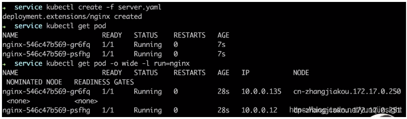 先创建一组 pod,就是创建这个 K8s deployment,通过 kubectl create -f service.yaml。这个 deployment 也创建好了,再看一下 pod 有没有创建出来。如下图看到这个 deployment 所创建的两个 pod 都已经在 running 了。通过 kubectl get pod -o wide 可以看到 IP 地址。通过 -l,即 label 去做筛选,run=nginx。如下图所示可以看到,这两个 pod 分别是 10.0.0.135 和 10.0.0.12 这样一个 IP 地址,并且都是带 run=nginx 这个 label 的。