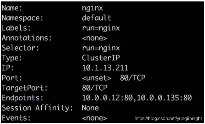 根据刚才介绍,通过 kubectl describe svc 可以看到这个 service 实际的一个状态。如下图所示,刚才创建的 nginx service,它的选择器是 run=nginx,通过 run=nginx 这个选择器选择到后端的 pod 地址,就是刚才所看到那两个 pod 的地址:10.0.0.12 和 10.0.0.135。这里可以看到 K8s 为它生成了集群里面一个虚拟 IP 地址,通过这个虚拟 IP 地址,它就可以负载均衡到后面的两个 pod 上面去。