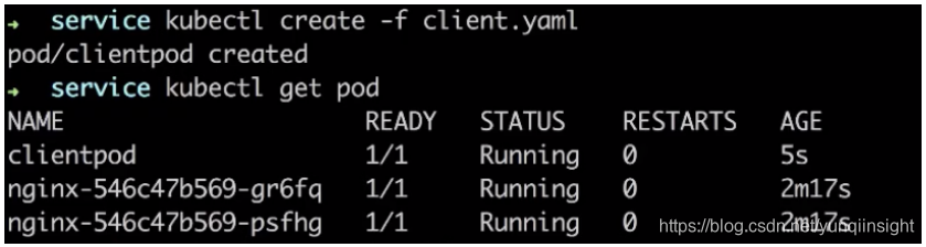 现在去创建一个客户端的 pod 实际去感受一下如何去访问这个 K8s Service,我们通过 client.yaml 去创建客户端的 pod,kubectl get pod 可以看到客户端 pod 已经创建好并且已经在运行中了。