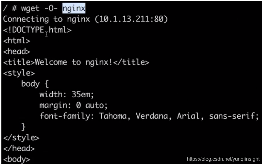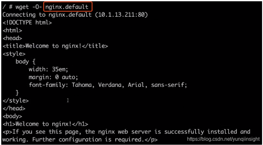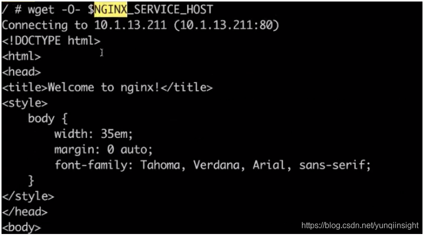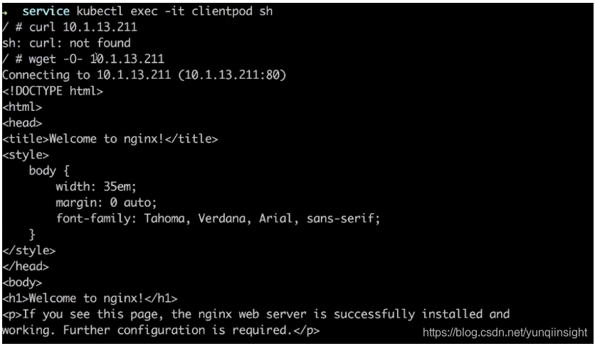 第二种方式,可以通过直接 service 名字的方式去访问到这个 service。同样通过 wget,访问我们刚才所创建的 service 名 nginx,可以发现跟刚才看到的结果是一样的。