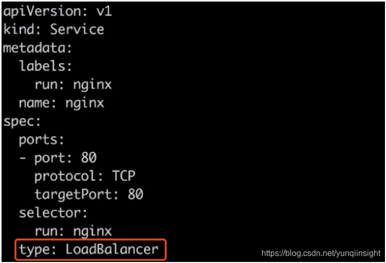最后我们添加一个 type,就是 LoadBalancer,就是我们前面所介绍的外部访问的方式。