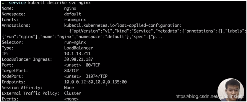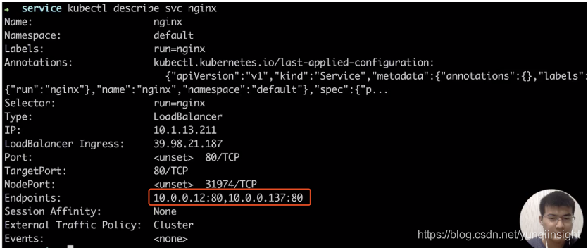 现在再去 describe 一下刚才的 service,如下图,看到前面访问端点就是集群的 IP 地址没有发生变化,对外的 LoadBalancer 的 IP 地址也没有发生变化。在所有不影响客户端的访问情况下,后端的一个 pod IP 已经自动放到了 service 后端里面。
