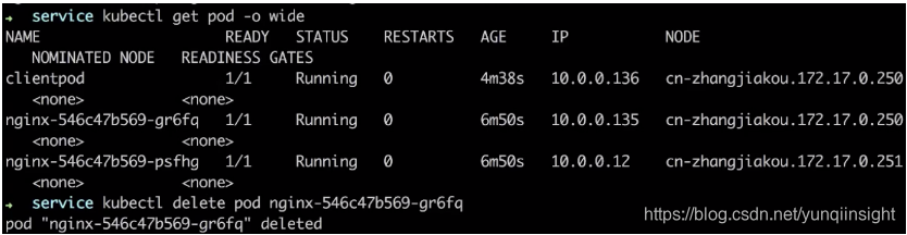 我们现在把其中的一个 pod 删掉,通过 kubectl delete 的方式把前面一个 pod 删掉。