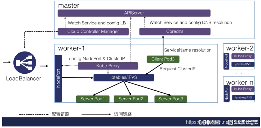 对于外部的流量,比如说刚才通过公网访问的一个请求。它是通过外部的一个负载均衡器 Cloud Controller Manager 去监听 service 的变化之后,去配置的一个负载均衡器,然后转发到节点上的一个 NodePort 上面去,NodePort 也会经过 kube-proxy 的一个配置的一个 iptables,把 NodePort 的流量转换成 ClusterIP,紧接着转换成后端的一个 pod 的 IP 地址,去做负载均衡以及服务发现。这就是整个 K8s 服务发现以及 K8s Service 整体的结构。