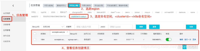 看到status中conditions中Ready为true表示创建成功,此时可以登录任务管理控制台查看任务创建情况,jobId可以方便后续在控制台进行任务和执行历史的搜索: