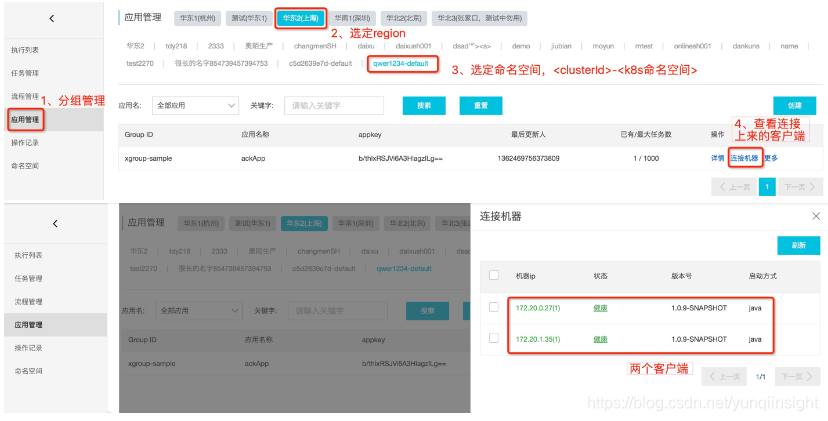 看到status中conditions中Ready为true表示创建成功,实际上,每个agentPool的创建都会在相同命名空间下创建名为[agentPoolName]-deployment的Deployment,可以自行查看,除此之外可以登录应用分组管理控制台查看执行器启动情况,是否正常连接到schedulerx客户端,可以看到已经正常启动两个客户端: