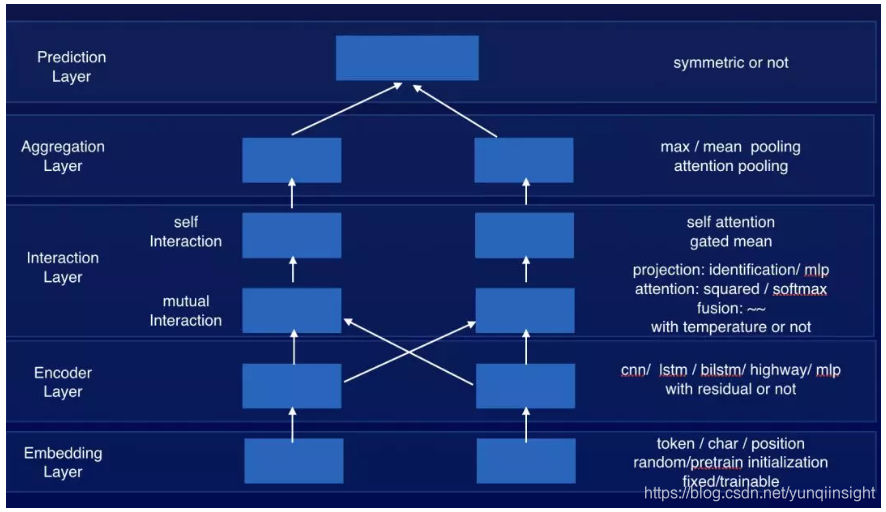 - 优秀的匹配模型都可以归纳成embed-encode-interacte-aggregate-predict五个步骤, interact部分主要是做inter-sentence alignment;
