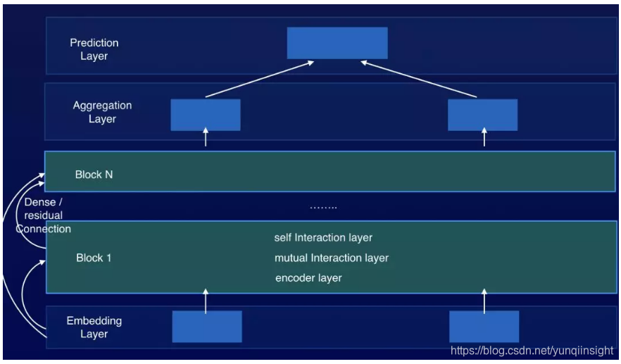 为了增强我们模型框架的表达能力, 我们将Encoder+Interaction Layer打包成一个Block, 通过堆叠多个Block, 通过多次的inter-sentence alignment,可以让我们的模型更充分地理解两句文本之间的匹配关系。