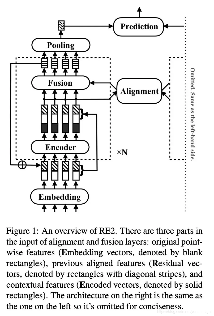 RE2包括有N个Block, 多个Block的参数完全独立。在每个Block内有一个encoder产出contextual representation, 然后将encoder的输入和输出拼在一起,做inter-sentence alignment,之后通过fusion得到Block的输出。第i个Block的输出,会通过Augmented Residual Connection的方式与这个Block的输入进行融合, 作为第i+1个Block的输入。