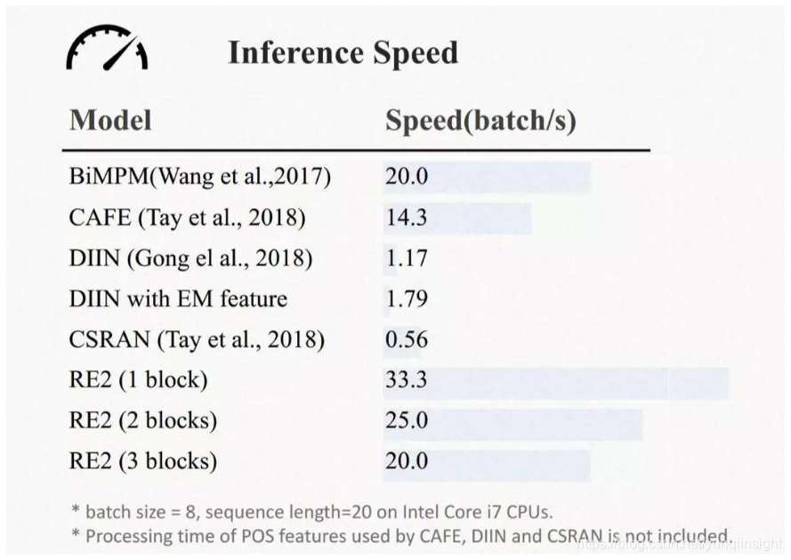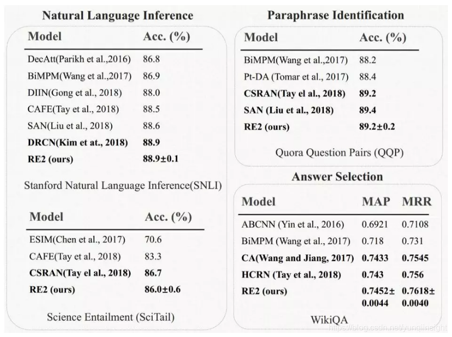 我们基于这种框架,通过大量试验得到一个模型结构RE2, 可以在各类公开数据集、和我们自己的业务数据上都能得到最优的结果,如下图所示。