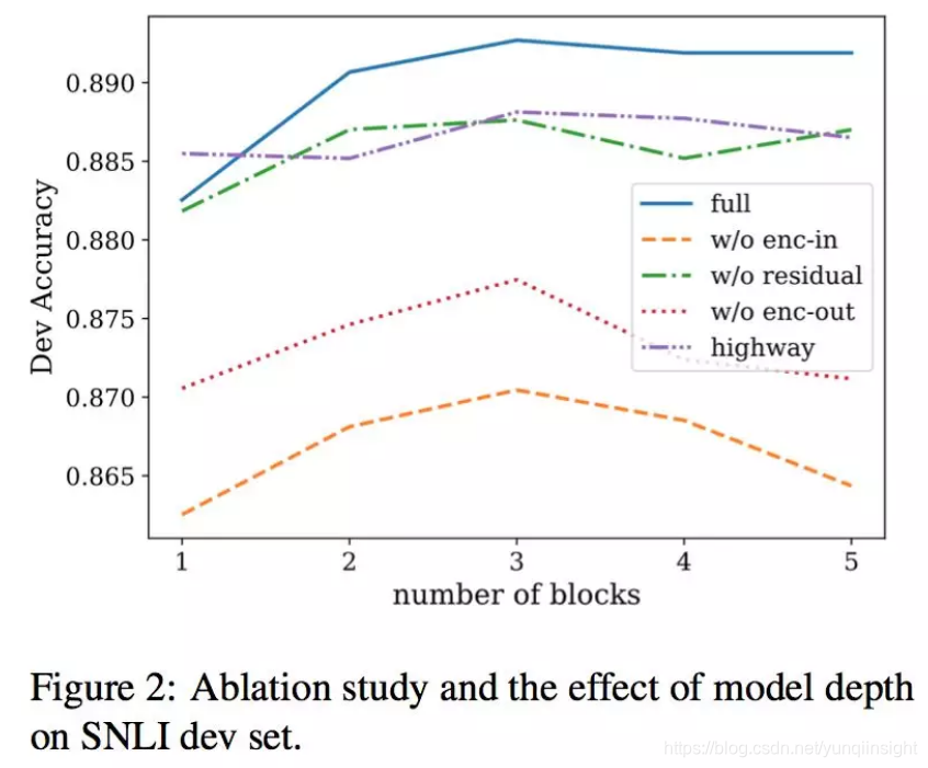 在SNLI上得到的结果如图所示。通过1)3)和完整模型的对比, 我们发现alignment layer只使用encoder的输出或只使用encoder的输入,都会得到很差的结果,说明原始的词向量信息、之前Block产出的align信息、当前Block中encoder产出的上下文信息,对最终的结果都是缺一不可的。通过2)和完整模型的对比,我们发现Block之间residual连接发挥了作用;而4)和完整模型的对比显示,我们直接拼接的方式是个更优解。