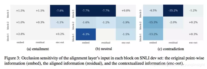 前面讲过, 在alignment layer的输入中,其实是三类信息的拼接:原始的词向量信息、之前Block产出的align信息、当前Block中encoder产出的上下文信息, 为了更好地理解这三份信息对最终结果的影响,我们参照机器视觉中相关工作, 进行了Occlusion sensitivity的分析。我们在SNLI-dev数据上,使用包含3个Block的一个RE2模型,分别将某层Block中alignment layer输入特征的某部分mask成0向量,然后观察在entailment、neutral 、 contradiction三个类别上的准确率变化: