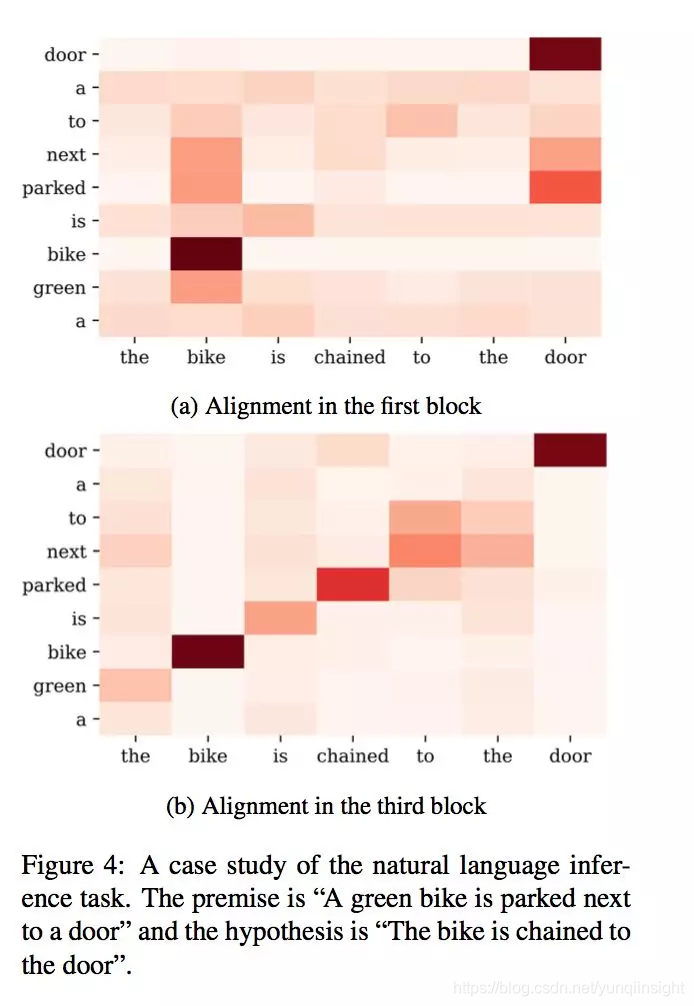 这个case中, 两句话分别是“A green bike is parked next to a door”“The bike is chained to the door”。在第一层Block中,是词汇/短语级别的对齐, 而“parked next to”和“chained to”之间只有很弱的连接,而在第三层Block中, 可以看到两者已经对齐, 从而模型可以根据“parked next to”和“chained to”之间的关系,对两句话整体的语义关系做出判断。从中也可以看到,随着Block的递增, 每层Block的alignment关注的信息都随之进行着调整,通过不止一次的alignment, 可以让模型更好地理解两句话之间的语义关系。