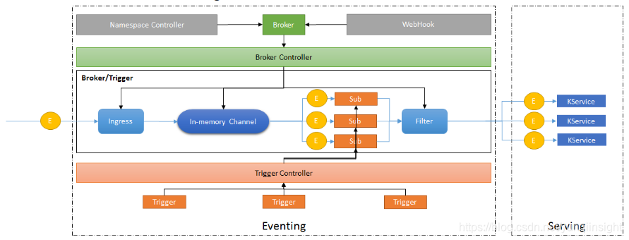 我们先整体看一下Knative Eventing 工作机制示意图: