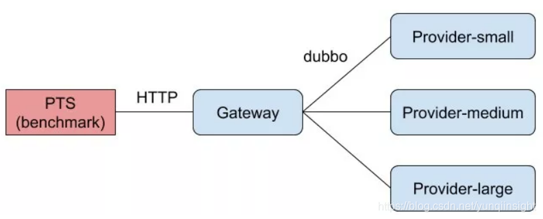 本次挑战赛的场景由施压程序(阿里云性能测试PTS)、服务调用方(Consumer)和三个规格不同的服务提供方(Provider) 组成。在评测过程中,每个程序都部署在不同的物理机上,以避免因 CPU、网络资源的竞争,导致评测程序抖动,影响最终评测成绩。
