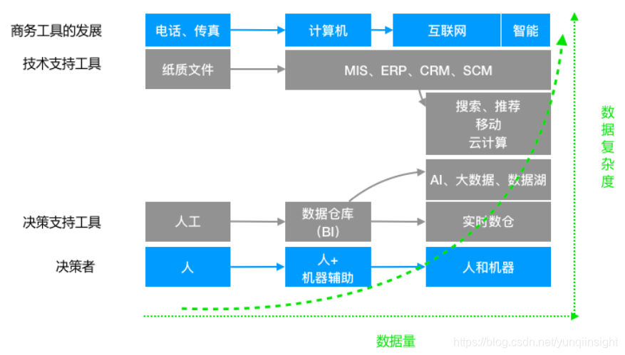 - 互联网的在线特性也将业务需求推向了实时化,随时根据当前客户行为而调整策略变得越来越常见,比如大促过程中库存管理,运营管理等(即既有中远期策略型,也有短期操作型);同时公司业务互联网化之后导致同时服务的客户剧增,有些情况人工难以完全处理,这就需要机器自动决策。比如欺诈检测和用户审核。